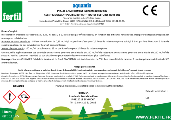 Mouillant pour substrat horticole. Préserve les caractéristiques hydriques des substrats. L’usage de ce produit est réservé aux cultures hors-sol non alimentaires. N° d’homologation: 9810015.